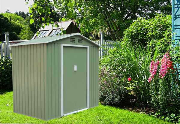 Металлический хозяйственный блок состоит из металлического каркаса и обшивается профлистом. Продается готовым комплектом. Металлический хозблок для дачи можно собрать своими руками без применения сварки. В отличие от пластикового хозблока сборка занимает немного больше времени. Металлический хозблок обычно не имеет пола, поэтому предварительно необходимо подготовить место для установки, например, уложить тротуарную плитку или залить бетонную площадку.
