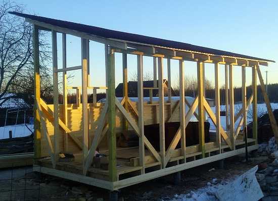 Дале на готовое основание хозблока устанавливаются вертикальные опоры из бруса 80х80 или 100х100 мм и укладываются стропила. Для стропил используют доску 40х120 мм. На стропила крепят обрешетку из доски 25х120 мм. Все элементы хозблока скрепляют с помощью саморезов и металлических строительных уголков.