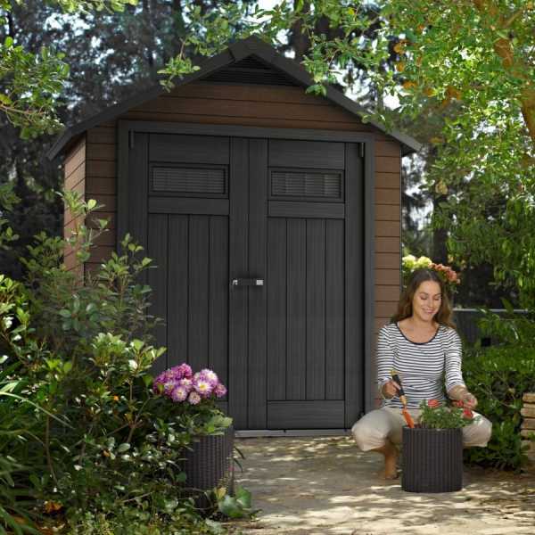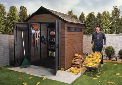 Она состоит из отдельных секций. Её легко транспортировать к месту установки. На сборку тратится не более трех часов. Монтаж происходит без специфических инструментов и крепежей. Все необходимое есть в комплектации. Пластиковый хозблок мобилен, поэтому очень подходит для дачи. Его не надо ставить на фундамент и можно беспрепятственно перемещать по территории.