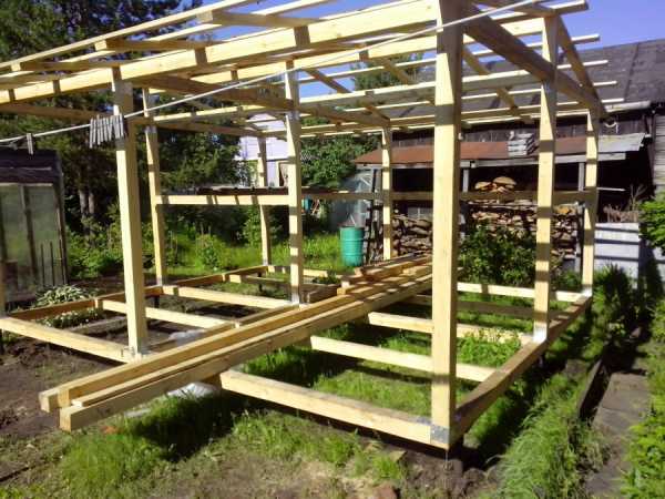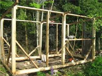 Рис.13. На собранное основание устанавливают вертикальные опоры из бруса 100х100 мм с шагом 06 – 1 м. Для придания конструкции устойчивости вертикальные брусья скрепляют диагональными перемычками. Все элементы конструкции соединяются саморезами и строительными уголками. Основа крыши стропила из доски 40х100 мм. Для обрешетки используется доска 25х100мм. Покрытие крыши может быть любым.