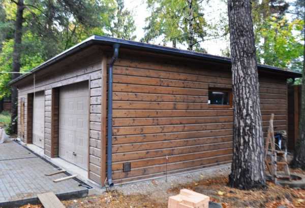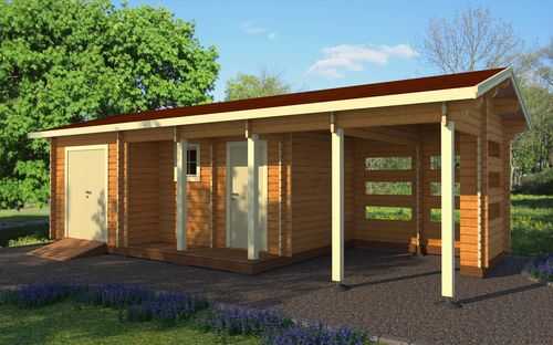Постройки гаражного типа представляют собой закрытое помещение с примыкающим навесом. На этапе строительства дома крытая часть может служить и временным жилищем, и складом, а под навесом паркуется автомобиль. Такую времянку впоследствии можно переоборудовать в крытый гараж, мастерскую или летнюю кухню.