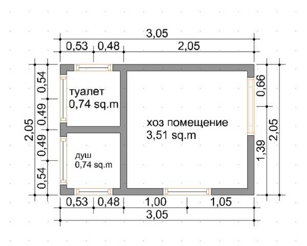 Рис.5. Оптимальные размеры внутренних частей хозблока приведены на чертеже. С правой стороны расположены два небольших помещения для душа и туалета. Для организации душа достаточно на крыше хозблока установить бак с водой. В течении дня солнце будет нагревать воду, и вечером можно принять теплый душ.
