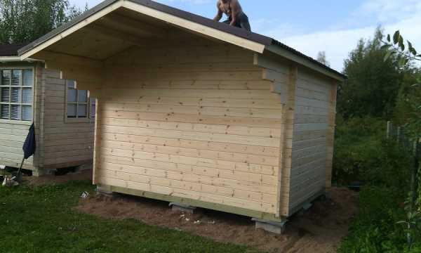 Деревянный хозблок для дачи не считается громоздким строением, поэтому и в солидном фундаменте нуждаться не будет. Однако устойчивое основание под него обустроить необходимо, так что копайте яму 40х40, засыпайте ее песком, трамбуйте его и несколько раз заливайте водой. В таком состоянии котлован оставляют выстаиваться и усаживаться на неделю. После этого на песок укладывают бетонные блоки с интервалом в полтора метра. Далее выстилается слой рубероида, и укладывается брус.