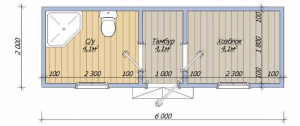Рис.4. Если хозблок это единственная постройка на даче, то в ней необходимо предусмотреть душ, туалет и комнату отдыха. После постройки дома комнату отдыха можно использовать как склад инвентаря.