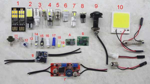 А моя коллекция выглядит так, на ней представлены светодиоды цоколей Т10 и Т5 и другие модели (о них расскажу ниже), стабилизаторы напряжения.