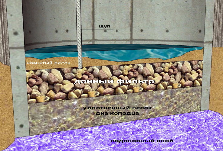 Ее герметично фиксируют к донному кольцу (нижней части шахты). В щите делают отверстия, которые заполняют пористым бетоном (с содержанием воздуха приблизительно 85%). Просачиваясь через эти поры, вода будет содержать минимальное количество примесей.