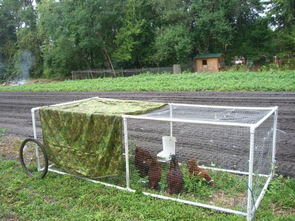 Они компактные, легкие, сверху закрыты сеткой или навесом, чтобы куры не перелетали через невысокие стенки. Есть конструкции переносные, оснащенные по бокам выступающими ручками, есть более удобные – на колесиках. Такие загоны легко передвигаются по ровному участку усилиями одного человека, в отличие от переносных, которые нужно поднимать вдвоем.