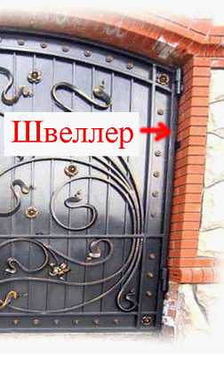 Очень часто случается так, что швеллер отсутствует или скрыт под слоем кирпича. Придётся его установить. Если у кирпичной опоры внутри имеется армирование толстым металлом, достаточно будет просто закрепить на нём короткий кусок швеллера, по высоте примерно равный длине створок. Данное крепление выполняется при помощи закладных, в качестве которых используются металлические пруты или арматура, забиваемые в кладку по краям швеллера и привариваемые к нему.