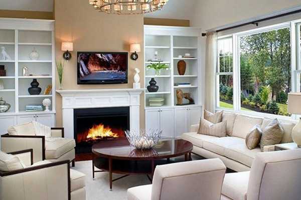 В просторной комнате нужно выделить композиционный центр, который, в первую очередь, будет обращать на себя внимание. Центром композиции может служить абсолютно любой предмет интерьера: необычный столик с ажурной столешницей или витыми ножками, яркий необычный коврик, камин. Другие предметы интерьера нужно расставлять учетом центра композиции.