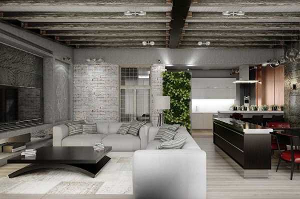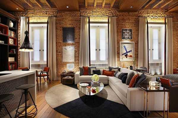 Гостиная в стиле лофт – это большое просторное помещение с высокими потолками и панорамными окнами. Она чаще всего объединяется с соседствующими комнатами и может быть отделена от них лишь стеклянными перегородками. Здесь присутствуют такие зоны, как столовая, территория отдыха с большим диваном, барная стойка, прихожая (в лофтовых квартирах нет отдельного входного тамбура), гардеробная, рабочая зона и пр., поэтому вопрос зонирования пространства очень важен.