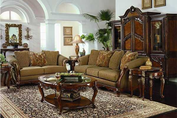 Территорию зала не стоит сильно загромождать мебелью, чтобы оставить достаточно свободного места. Стандартный набор мебели предполагает наличие дивана, кресел, журнального столика, стеллажей или модульных конструкций гарнитура. Профессиональные дизайнеры избегают расстановки мебели в гостиной вдоль стен, считая это пережитком прошлого. Лучше выбрать один центральный элемент (зону отдыха с диваном и телевизором или камин), от которого будет отталкиваться вся последующая обстановка.
