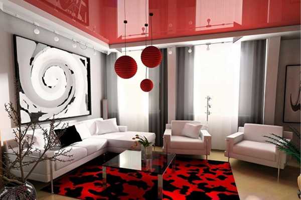 Оформление потолочной поверхности в большей степени зависит от габаритов помещения. Для комнат с низкими потолками лучше остановить выбор на классической белой побелке или покраске или натяжных конструкциях. Если же зал имеет высокие стены, можно использовать дизайн поверхности с гипсокартоном, натяжными полотнами, создавая уровни. Фигурные потолки нередко играют немаловажную роль в выделении определенных зон.