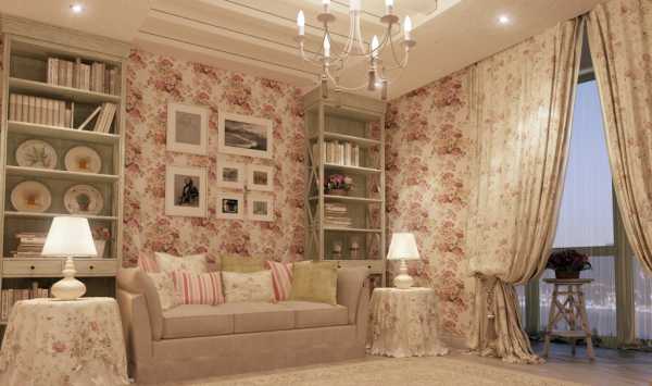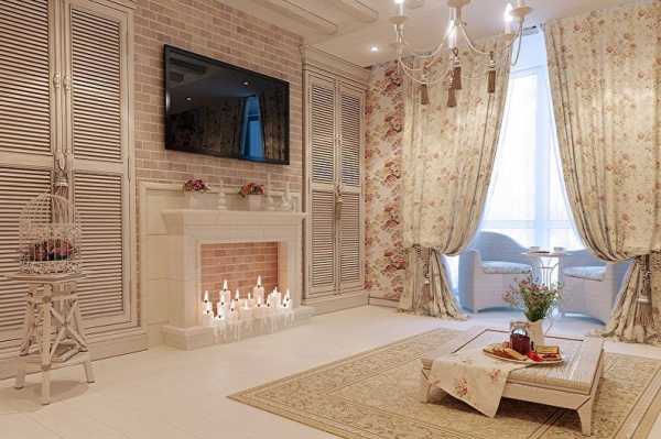 Универсальный светлый прованс подойдет для любого помещения, превращая его в уютный тихий уголок. Оформление зала в данном направлении потребует присутствия деревянной мебели (желательно искусственно состаренной), камина, натуральных отделочных материалов (камень, кирпич, дерево), больших оконных проемов, через которые будет поступать солнечный свет. Поддержать колорит помогут такие элементы, как: обои с крупными цветами, под стать которым подбирается текстиль, старинные рамы на стенах, декоративные подушечки, фарфоровые статуэтки. Предпочтение отдается легким пастельным тонам отделки.