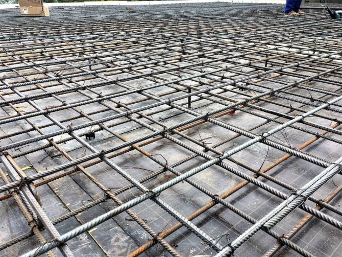 Дальше приступают к укладке арматуры, которая придает конструкции прочность. Используется металлическая сетка из проволоки диаметром 6 мм и больше. Размер сварных ячеек — не меньше 100×100 мм. Укладывают листами внахлест. Вместо сетки армируют прутками сечением от 8 мм, которые связывают между собой.