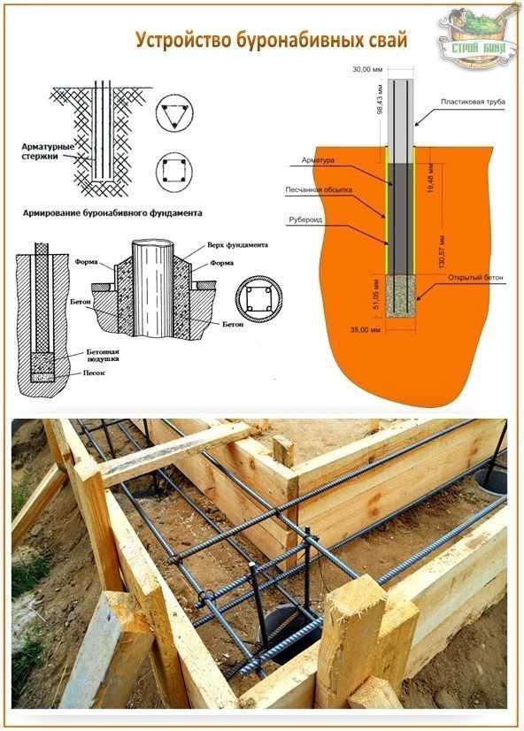 В пробуренную скважину устанавливают опалубку и армирование. Работа выполняется методом вдавливания. После того, как буром достигнута глубина заложения, необходимо изъять со дна скважины рыхлый грунт. Опорную часть основания трамбуют, после чего укладывают подушку из крупного или среднего песка. Толщина подушки назначается от 30 до 50 см. Она должна учитываться, когда назначается глубина заложения и отметка бурения.