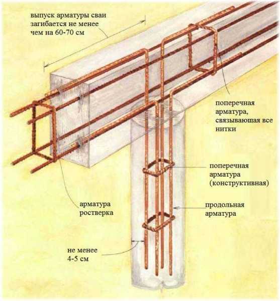 Сделать свайный фундамент своими руками можно сделать и без арматурного каркаса, но прочность её будет значительно ниже, ведь свая работает не только на сжатие, но и на растяжение. Тянет её расширяющийся при замерзании грунт. Кроме того сваи могут испытывать нагрузку от горизонтального смещения почвы (скажем, при оползнях).Для каркаса используем 3-4 арматурных стержня d 6-8 мм. Стержни в единую конструкцию скрепляем через 500-600 мм по высоте поперечинами или хомутами. Готовый каркас располагаем так, чтобы он вошёл в скважину на всю её глубину, а снаружи возвышался на высоту ростверка, за вычетом 2-3 см (защитный слой). Не забываем про защитный слой бетона для арматуры по высоте тела сваи: располагаем каркас не вплотную к опалубке, а с зазором 3-5 см.