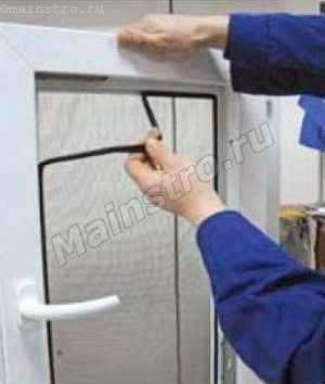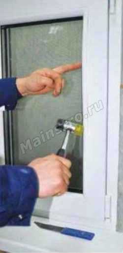 Створку окна укладывают на ровную поверхность. С уплотнителя снимают защитную ленту. Монтаж делают выступом, предназначенным для крепления в паз, проходящий по периметру створки и рамы. Ленту слегка прижимают. После этого створку возвращают на место.