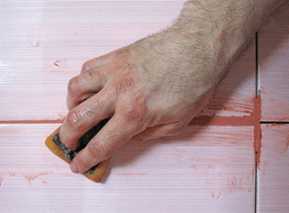 Если швы глубокие, и есть как минимум 2 миллиметра до плоскости плитки, поверх старого слоя наносится новый. Чтобы улучшить качество соединения слоев, предыдущий следует хорошенько очистить от грязи и пыли, а также увеличить шероховатость с помощью крупнозернистой наждачной бумаги. Перед нанесением свежей затирки швы следует смочить.