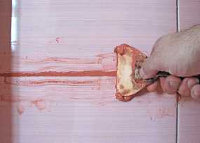 - На шпатель наносится небольшое количество свежеприготовленной затирки, которая под усилием впрессовывается в шов. Важно следить за тем, чтобы затирка не выступала за лицевую сторону плитки.