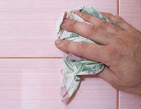 Сразу после нанесения раствора можно приступить к очистке плитки своими руками. Для этого следует пользоваться мягкой поролоновой губкой, которую следует часто мыть и хорошо выдавливать. Губка должна быть едва влажной, дабы не вымывать раствор со швов. Губкой следует вести вдоль шва, таким образом вы сформируете окончательную форму линии. Впрочем, самым лучшим вариантом является заглаживания линии указательным или большим пальцем. Учтите, что затирка должна быть ниже уровня плитки, как бы в углублении. После всего плитку следует вытереть насухо чистой тряпкой. Уже после добиться идеальной чистоты поможет полировка. Затирку с плитки хорошо удаляют такие средства, как столовый уксус, лимонный сок, нашатырный спирт или же зубная паста.