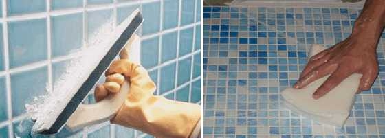 Остатки раствора на керамике удаляются при помощи воды и шпателя. Намочите излишки, а затем аккуратно соберите их скребком. Оставшиеся разводы устраняются влажной тряпкой или губкой. Если кафель имеет ребристую или неровную поверхность, то чистка проводится зубной щеточкой. На конечном этапе лучше использовать средство для стекол, которое хорошо полирует поверхность.