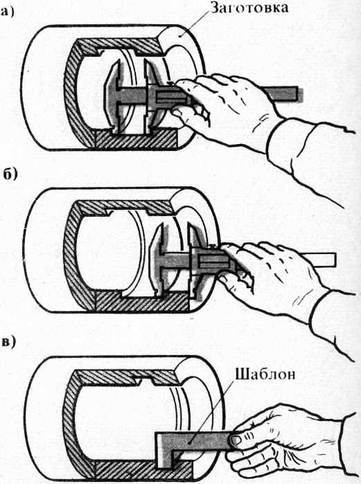 Чтобы расточить ступенчатое отверстие с применением упора, необходимо упор закрепить в резцедержателе вместе с резцом и расточить отверстие до тех пор, пока торец планки не подойдет вплотную к торцу заготовки.