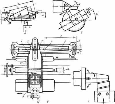а – смещением задней бабки; б – поворотом верхней части суппорта; в – с применением конусной линейки; г – широким резцом