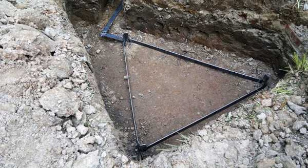 - На выкопанной площадке размечается равнобедренный треугольник, вершины которого должны располагаться на расстоянии 1−1.5 м друг от друга.