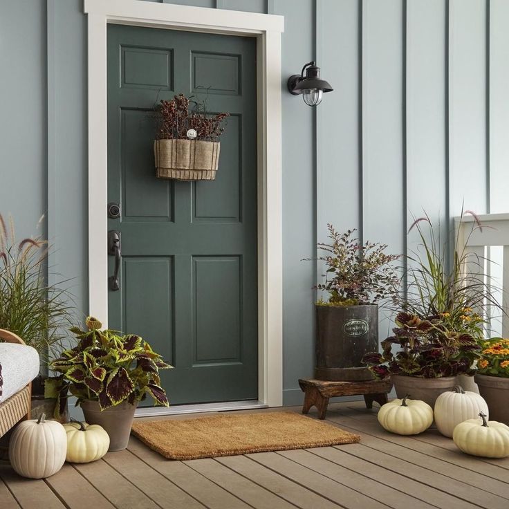 Оливково-зеленая дверь от Oliver and Rust придает входу свежий, чистый вид.