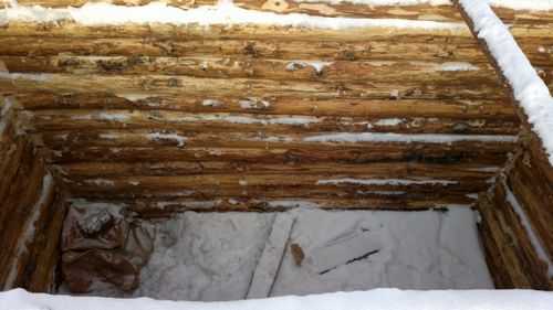 - Делается потолок погреба. Для этого устанавливаются жерди, затем их покрывают смесью из соломы и глины, а сверху все засыпается землей.