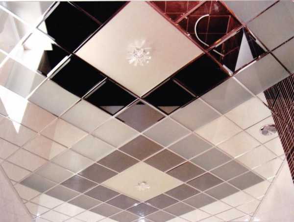 двухуровневый потолок с зеркальной плиткой придаст интерьеру неповторимый стиль