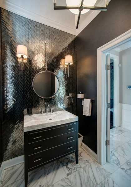 Эти помещения чаще всего отделывают зеркалами. Но использование декоративного покрытия с отражающей поверхностью и фацетом выглядит немного иначе, чем простое зеркало: скошенные стороны тоже имеют эффект отражения и при стыковке создают имитацию крупной сети, через ячейки которой видно отраженное пространство. Если нужно получить цельное зеркало без указанного эффекта, то лучше выбирать плитку с ровными кромками.