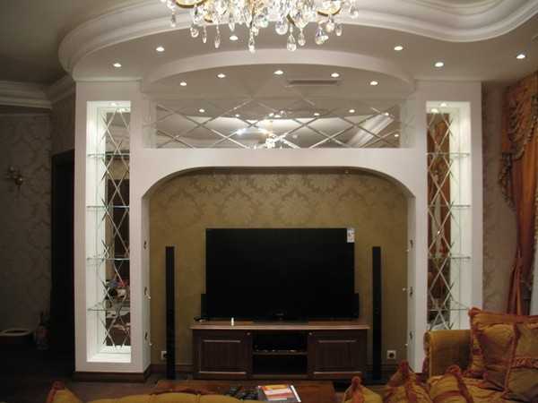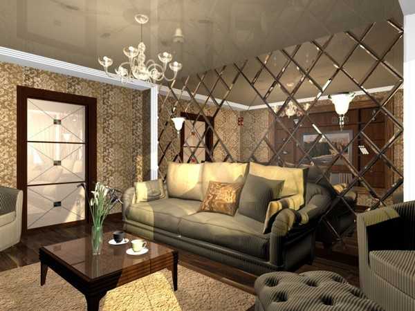 При низком уровне освещенности небольшого помещения выигрышно выкладывать зеркальным материалом небольшой участок над люстрой. Свет, отражаясь от зеркала, умножится, комната станет светлее в несколько раз.
