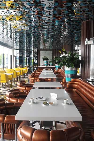 зеркальная потолочная плитка нестандартной формы в интерьере столовой