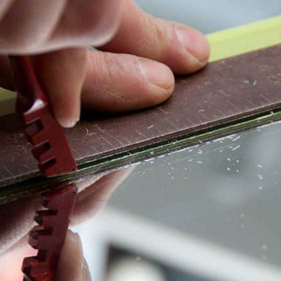 Для идеальной подрезки кусочков используют стеклорез. Края становятся ровными, гладкими, без сколов. Остальные особенности укладки аналогичны укладке кафеля: подготовка, выравнивание поверхности перед работой, раскладывание по уровню и приклеивание.