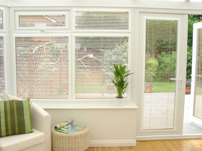 Вертикальные жалюзи — стандартное решение для раздвижных стеклянных дверей.