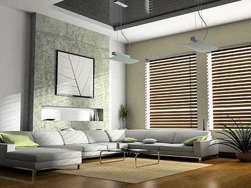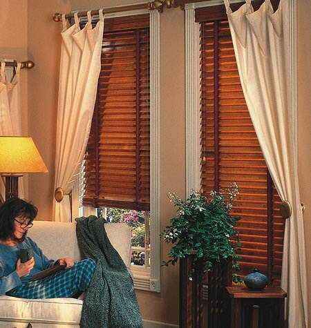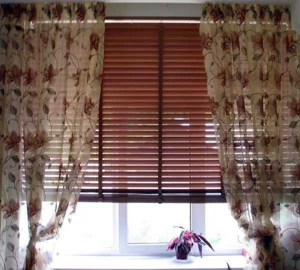 Деревянные жалюзи прекрасно будут сочетаться с тюлем в интерьере гостиной. Дизайн помещений всегда сочетал в себе комбинацию дерева и ткани, например, диван с обивкой, стол с кружевной скатертью и салфетками, кровать с узорчатым покрывалом.