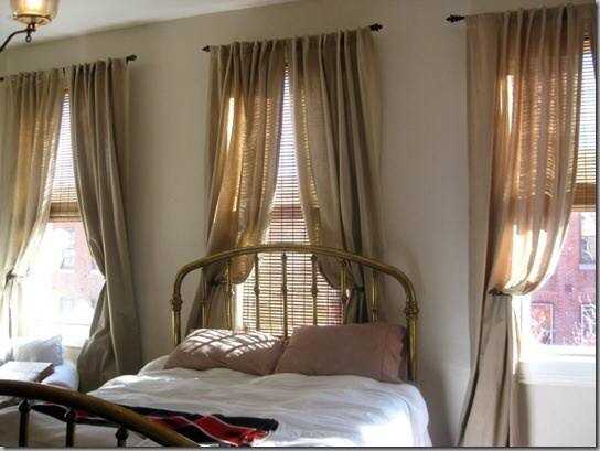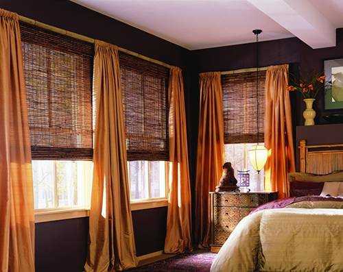 - В спальных комнатах сочетайте тканевые занавесы и рулонные изделия из натуральных материалов — бамбука, мешковины. Последний вариант заслуживает особого внимания — пошив штор из мешковины дешев, такие полотнища стоят копейки, но при этом они отлично смотрятся в любом интерьере;
