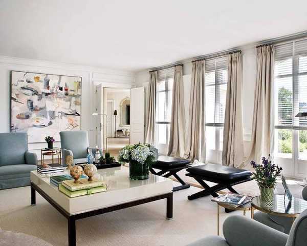- Гостиная — пространство для реализации масштабных идей. Для оформления окон в ней можно использовать тройные шторы — портьеры, состоящие из трех последовательно расположенных друг за другом слоев ткани, сочетающихся как по окрасу, так и по фактуре текстиля.