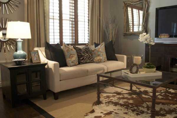 При правильном выборе рулонных штор можно придать элегантность гостиной и подчеркнуть безупречный вкус хозяев. К тому же они экономят пространство у окна. Лучше всего остановить выбор на тяжелых и плотных тканях с полной блэкаут, или со средней степенью затемнения. Цвет полотна оптимально выбирать под тон мебели, а не стен. Рулонные шторы в интерьере гостиной превосходно смотрятся, если рисунок на них перекликается с декором комнаты, например, узорами на мебели, обоях или диванных подушках.