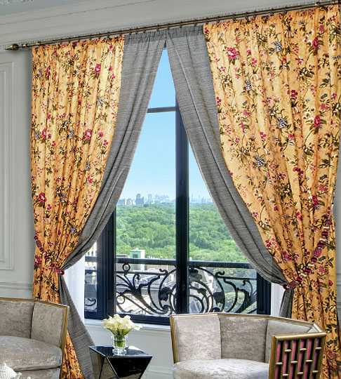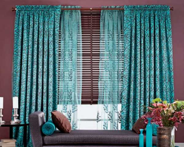 - Дополнение однотонного полотна рисунком — так комбинируются двойные занавесы: первый слой ткани берем яркого, насыщенного цвета, к нему подбираем полотно с рисунком или узором, в оформлении которого присутствует базовый оттенок;