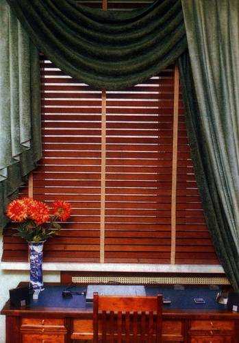 - В рабочем кабинете , где во главе дизайнерской идеи стоит лаконичность, скомбинируйте жалюзи из дерева и римский занавес — на выходе получается строгое, деловое оформление;