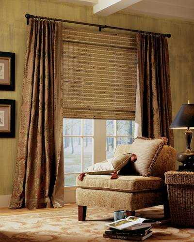 Для примера возьмем сочетание классических тканевых гардин и рулонных штор из бамбука: