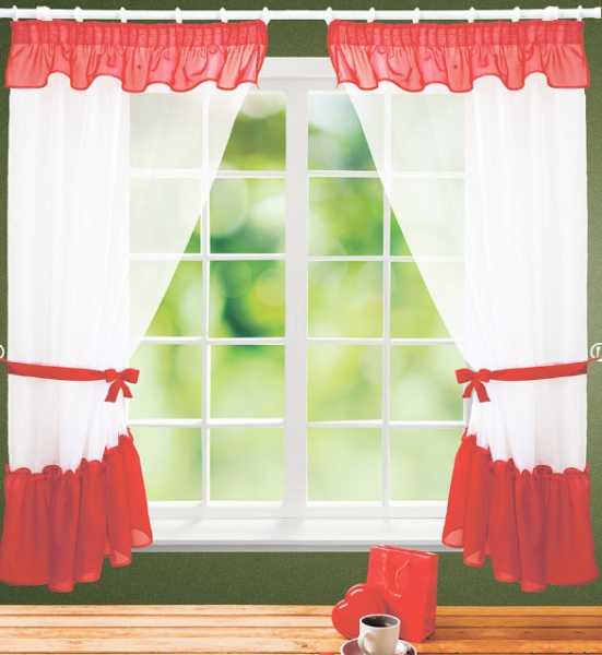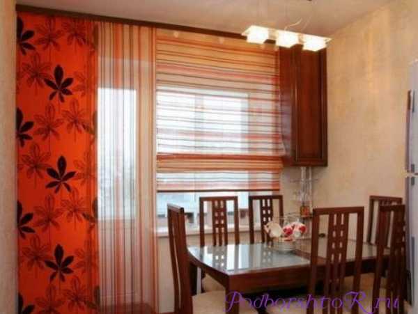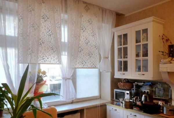 Так можно скомбинировать шифон для кухонных штор и рулонный занавес. Подобрав правильную палитру цветов — контрастное либо тональное сочетание оттенков, вы получите изысканный и красивый, но при этом функциональный декор оконного проема.