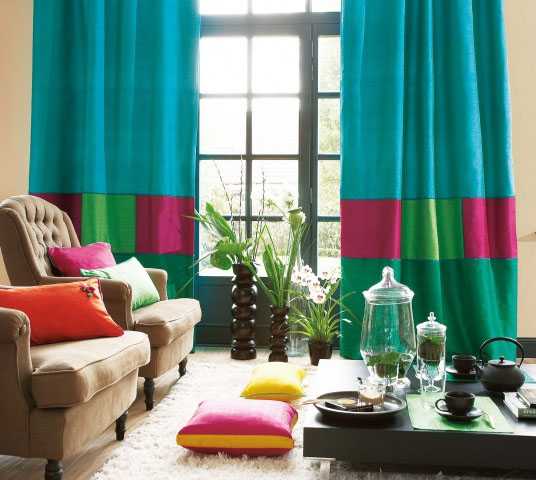 Если комбинацию из разных видов занавесов вы считаете не практичной либо чрезмерно вычурной, но что-то свежее в интерьер внести все же хочется, можно остановиться на сочетании тканей разных цветов в рамках оформления одного окна.