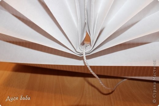 Среднюю нить продевают сквозь отверстия в бумаге, не фиксируя в каждой складке. Длина средней нити должна в 2 раза превышать длину жалюзи.
