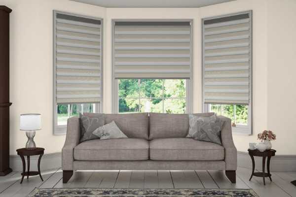 Очень интересно смотрятся рулонные шторы день-ночь, которые состоят из двух слоев полосатого материала. Одна полоса на полотне является прозрачной и выполняется чаще всего из сетки. Другая, напротив, не пропускает свет. Регулировка освещенности помещения в данном случае может выполняться смещением темных и светлых полос друг относительно друга без необходимости полного поднятия полотна.