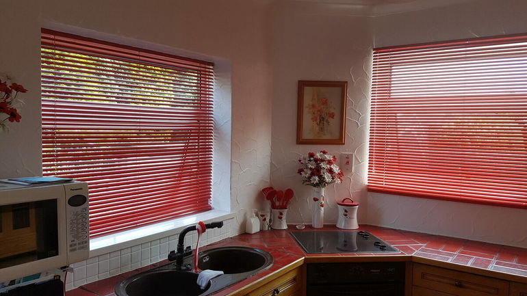 Красные жалюзи являются сильной доминантой. В кухне они должны сочетаться еще с какими-нибудь элементами интерьера красного цвета: например, с фартуком или с текстилем.
