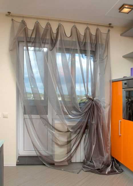 Нередко текстильные конструкции для оформления блока, состоящего из окна и балконной двери, выполняются ассиметричными — например, полотно шторы фиксируется подвязками около окна. Однако это не возбраняет добавить эстетичности двери на балкон, используя для ее оформления самые разные способы: