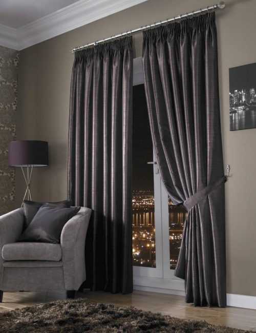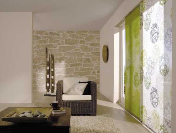В небольших комнатах для визуального расширения помещения используется особый прием – шторы во всю ширину стены. Они полностью закрывают собой дверной проем балконной двери и окно, создавая видимость, что за драпировкой скрывается стена. Существует два типа штор, которыми можно закрыть всю стену.